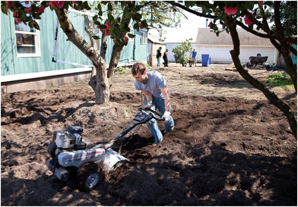 Warren Peterson wrestles a rototiller through the yard as a resident work crew prepares the yard for leveling and planting at Faithful Servant Transitional House in Kelso. Residents also have daily chores they’re required to do as part of their contribution to the group living.